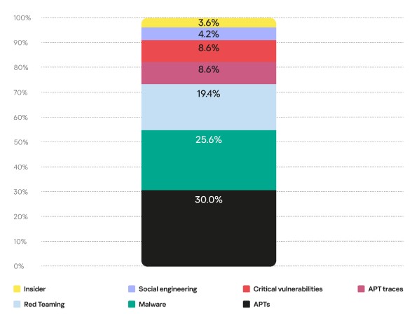 وعند النظر إلى طبيعة هذه الحوادث، فقد كان 30% منها مرتبطاً بنظم التهديدات المتقدمة المستمرة (APTs)، بينما استحوذت هجمات البرامج الخبيثة على نسبة 26%، بينما نتج ما يزيد قليلاً على 19% منها عن “القرصنة الأخلاقية” (اختبارات الاختراق، أو الفرق الحمراء، أو أي أنواع أخرى من التدريبات الإلكترونية التي يتم إجراؤها على البنى التحتية العملاء، إما لغاية التقييم الأمني لأنظمة تكنولوجيا المعلومات، أو لاختبار الجاهزية التشغيلية لخدمة خدمة الكشف عن التهديدات والاستجابة). وبلغت نسبة الحوادث التي تنطوي على نقاط ضعف حرجة متاحة للجمهور، واكتشاف آثار الهجمات السابقة التي يتورط فيها البشر ما يقرب من 9%. ونتجت الحوادث المتبقية عن الاستخدام الفعال لتقنيات الهندسة الاجتماعية، أو أنها كانت مرتبطة بتهديدات من الداخل.