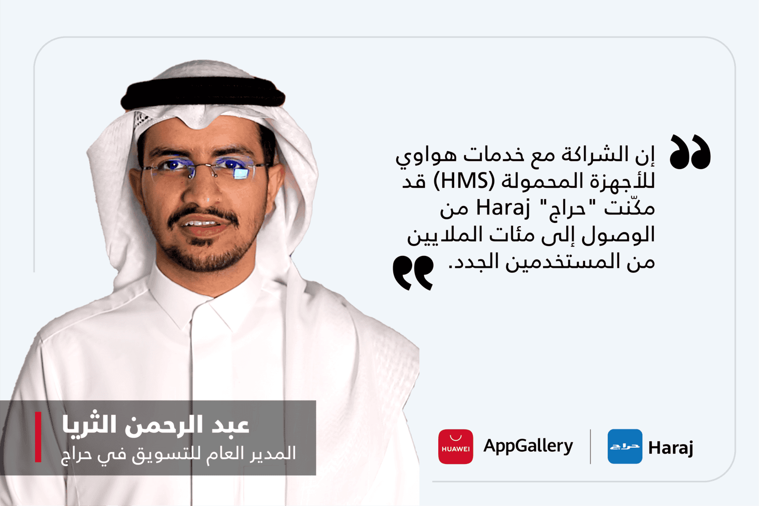 دبي، دولة الإمارات العربية المتحدة – 14 يونيو 2023: في مطلع عام 2020، انطلق تطبيق “حراج” Haraj ، وهو منصة تسوق إلكتروني تحظى بشهرة واسعة في المملكة العربية السعودية، في رحلة تحولية من خلال إضافته إلى متجر HUAWEI AppGallery، والتكامل مع خدمات هواوي للأجهزة المحمولة (HMS). وقد لعبت هذه الشراكة الاستراتيجية دوراً مهماً في نجاح ونمو “حراج” Haraj، مما مكّنها من أن تصبح من بين أكثر المنصات الرقمية زيارة في المملكة العربية السعودية. وفي هذه المقابلة، تشرفنا بالتحدث مع عبد الرحمن الثريا، مدير التسويق في تطبيق “حراج” Haraj، لاستكشاف المنافع والمزايا التي انعكست على أعمالهم من خلال شراكتهم مع خدمات هواوي للأجهزة المحمولة (HMS).