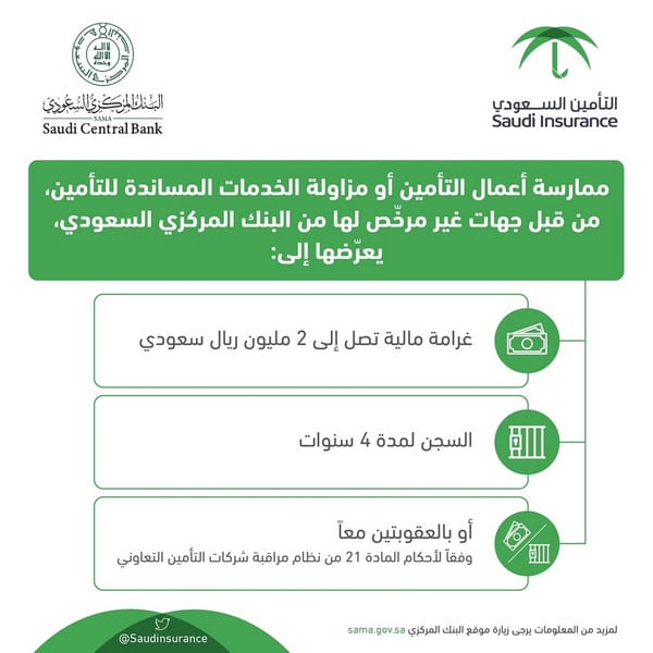 وفي هذا الصدد، أوضح عادل العيسى، المتحدث الإعلامي بإسم قطاع التأمين، أن كل من يمارس أعمال التأمين أو يزاول الخدمات المساندة للتأمين دون ترخيص بذلك من البنك المركزي السعودي، يتعرض لغرامة تصل إلى مليوني ريال والسجن لمدة أربع سنوات، أو بإحدى هاتين العقوبتين، وفقًا لأحكام المادة 21 من نظام مراقبة وشركات التأمين التعاوني، مشيراً إلى وجود قائمة الجهات المرخصة بممارسة أعمال التأمين منشورة على الموقع الالكتروني للبنك المركزي.