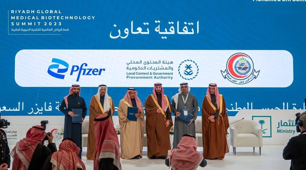 خلال قمة الرياض العالمية للتقنيات الحيوية الطبية، المنعقدة في 25-26 يناير 2023، وفي إطار خطط معهد فايزر العلمي بالتعاون مع هيئة المحتوى المحلي والمشتريات الحكومية، أعلنت شركة فايزر السعودية عن توقيع اتفاقية تعاون مع مركز الملك عبد الله العالمي للأبحاث الطبية في وزارة الحرس الوطني الشؤون الصحية، تستهدف تنفيذ مشروعين حيويين.