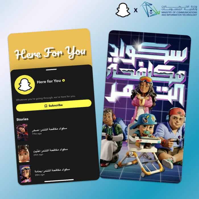 من جهته، قال عبد الله الحمادي، مدير الأعمال الإقليمي لشركة Snap Inc.: “يسرنا التعاون مع وزارة الاتصالات وتقنية المعلومات في المملكة لتمكين أفراد المجتمع وتوعيتهم حول أهمية إيلاء الأولوية لصحتهم النفسية. ويُعدّ إطلاق منصة Here For You خطوة ضرورية باعتبارها وسيلة فعالة في التواصل مع أكثر من 90% من الأشخاص الذين تتراوح أعمارهم بين 13 و34 عاماً في المملكة عبر تطبيقنا، لتزويد جيل الشباب بالموارد التعليمية والدعم اللازم عبر تجربة فريدة وهادفة ضمن التطبيق. لطالما كنا في Snap ملتزمين بضمان تزويد أفراد المجتمع بمصادر هامة حول الصحة النفسية وحريصين على إيلاء بالغ الاهتمام بصحتهم النفسية والجسدية”.